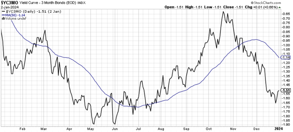 Below is an updated chart of the spread between the 3-month Treasury yield and the 10-year Treasury yield. When this yield curve inverts, it tends to be a reliable predictor of a recession. This yield curve inverted in October of 2022 and has an average 589-day lead time from date of inversion to the start of a recession.
