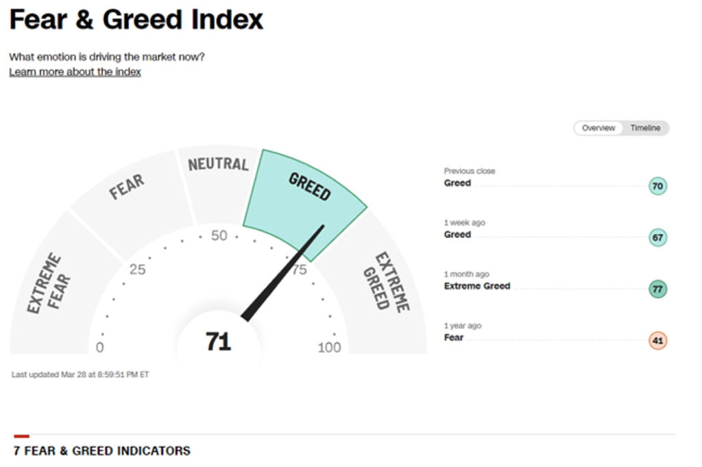 Investor sentiment is hovering around all-time highs. Most investors feel that equities and markets will never move lower. Below is a chart we use often, and it shows that investors are very optimistic on the markets. I want you to look at the 1 year ago number, it was at 41. This number is particularly important because this time last year, we had Silicon Valley Bank, Signature Bank, and First Republic Bank get shuttered by the FDIC, and the Federal Reserve launched the Bank Deposit Funding Program to prevent a systemic financial banking crisis. The S&P 500 traded as low as 3,800, investor sentiment collapsed and fear exploded higher. The average investor is often being driven by the emotions of fear and greed.